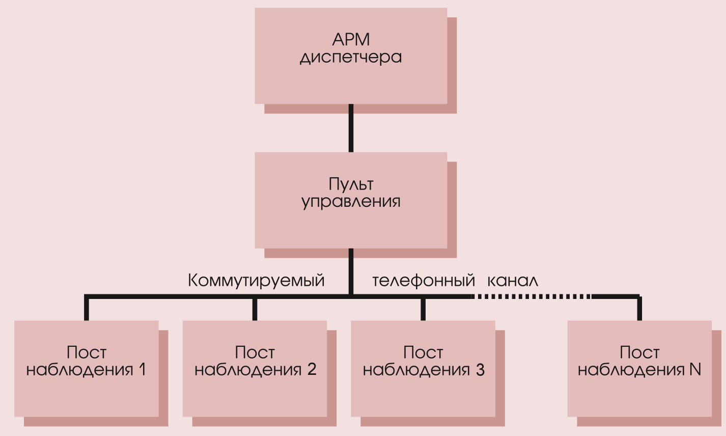 Нижний уровень представляет собой практически автономный пост наблюдения, установленный на объекте контроля. Связь со вторым уровнем — пультом управления — осуществляется по коммутируемой телефонной линии через модем.