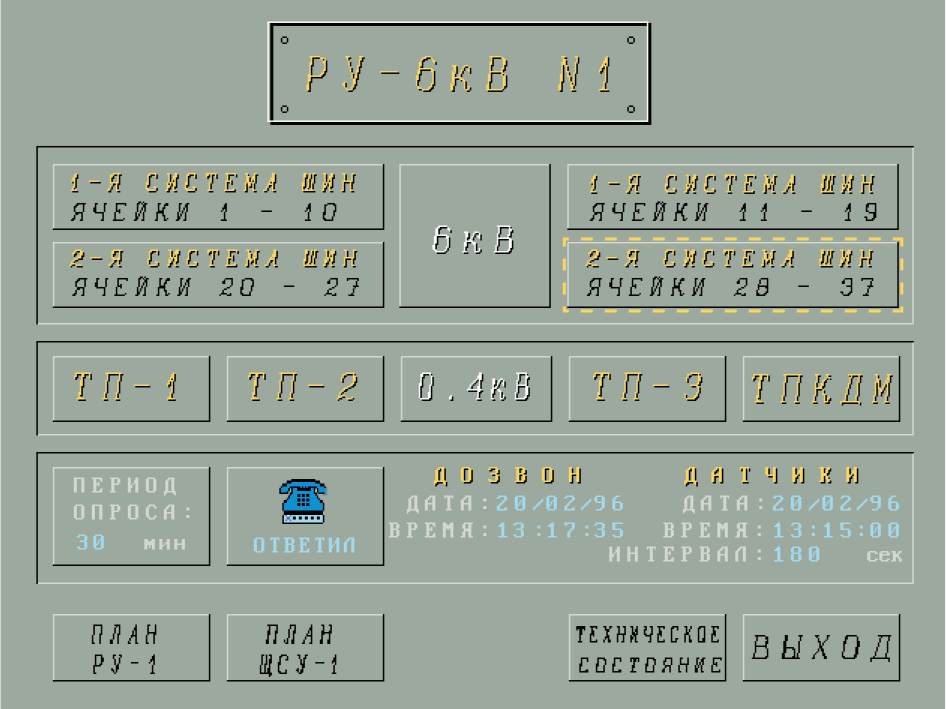 В меню поста наблюдения отображаются параметры связи по коммутируемой телефонной линии (период опроса, время последнего сеанса связи и его результат, время снятия данных на посту наблюдения), а также общее состояние объекта контроля: световая сигнализация указывает на изменение положения коммутационных аппаратов, срабатывание датчиков охранной сигнализации, нарушение питания. Для получения более подробной информации можно перейти на соответствующий виртуальный экран.