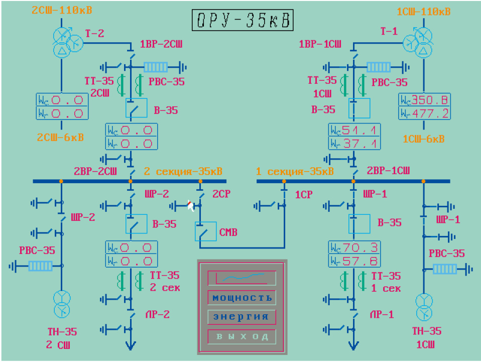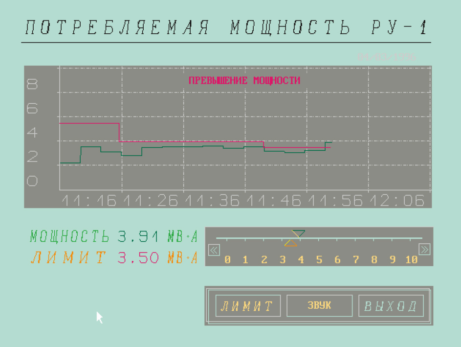 На электрических схемах показаны текущие значения активной и реактивной мощности по потребителям, активной и реактивной энергии, потребленной с начала месяца, положение коммутационных аппаратов, линии протекания тока. Графики мощности (рис. 4) позволяют контролировать превышение лимита мощности, заданного диспетчером. При превышении лимита включается звуковой сигнал, привлекающий внимание персонала.