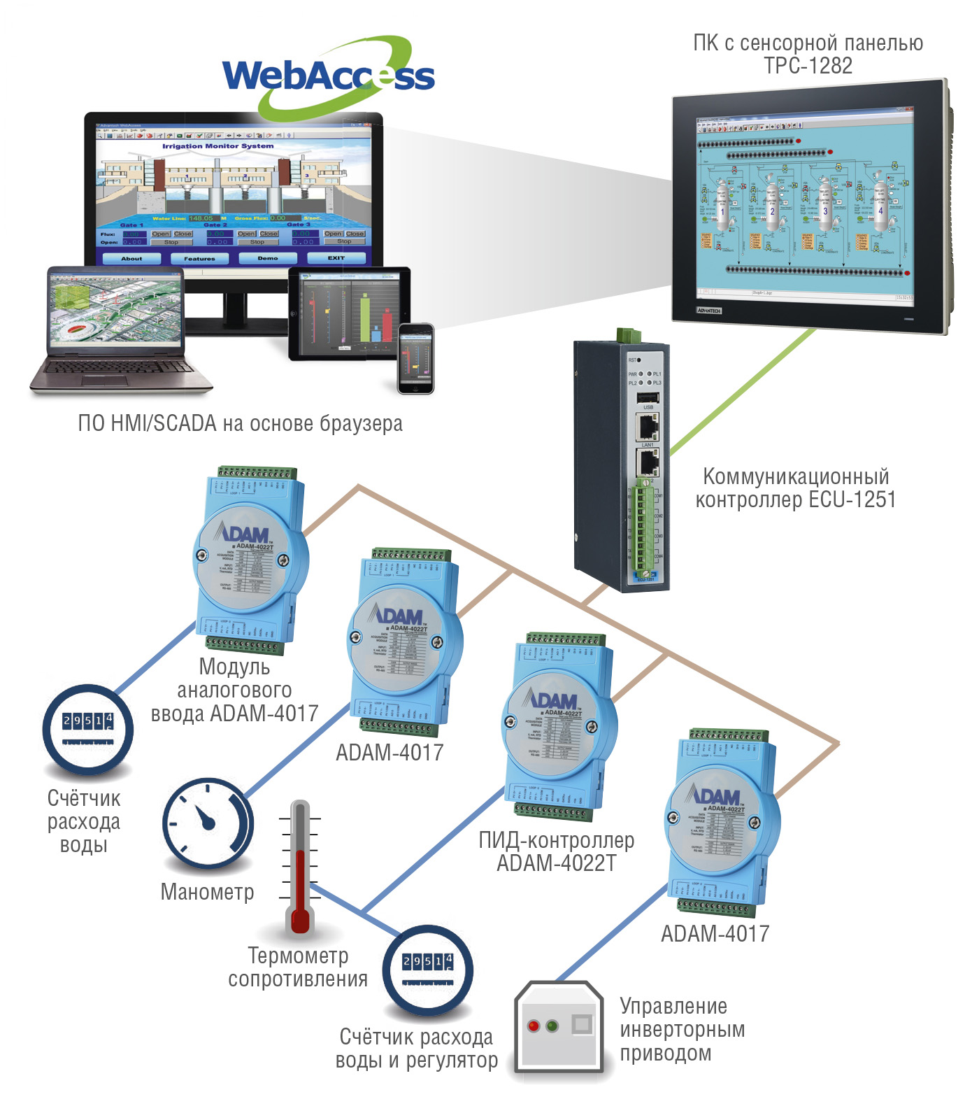 В паре с манометрами и расходомерами воды используется устройство ADAM-4017, позволяющее преобразовывать токовый (мА) или потенциальный (мВ, В) аналоговые сигналы в сигналы последовательного цифрового интерфейса RS-485. Устройство ADAM-4022T преобразует измеряемую температуру, снятую с подключённого термометра сопротивления (RTD), а также управляет расходом воды с помощью функций ПИД-регулирования, воздействуя на электромагнитный клапан на трубопроводе. Третий тип устройств – ADAM-4024 используется в качестве задатчика управляющих сигналов для силовой части частотных приводов насосов. Все устройства ADAM объединены в сеть под управлением коммуникационного контроллера ECU-1251, являющегося сервером последовательных интерфейсов, они подключены к управляющему блоку верхнего уровня на базе панельного компьютера TPC-1282. Мониторинг всех данных и устройств осуществляется при помощи программного обеспечения Advantech WebAccess/SCADA.