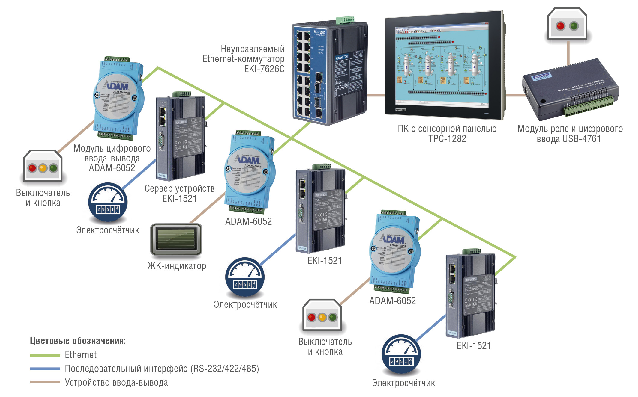 Отвечая системным требованиям, компания Advantech совместила решение нескольких задач в рамках одного экономичного и надёжного панельного компьютера с 12-дюймовой сенсорной панелью – TPC-1282T, используемого для управления тремя зарядными устройствами (ЗУ). Каждое ЗУ подключено к серверам последовательных интерфейсов EKI-1521 и модулям ввода-вывода ADAM-6052. Они считывают данные с электросчётчиков и управляющие сигналы с выключателей нагрузки и кнопок, а также осуществляют индикацию. EKI-1521 представляет собой сервер последовательных устройств с одним портом RS-232/422/485, двумя независимыми портами Ethernet и MAC-адресами, который реализует механизм избыточной сети для обеспечения надёжности коммуникаций. В свою очередь, ADAM-6052 также поддерживает работу в сети Ethernet, оснащён 8 цифровыми входами и 8 цифровыми выходами и подходит для любых систем с низкой токовой нагрузкой. За объединение трёх ветвей контроля зарядных устройств с управляющим панельным ПК отвечает промышленный Ethernet-коммутатор EKI-7626C. Он оборудован двумя комбинированными гигабитными портами для работы с волоконно-оптическими и медными линиями. Благодаря модулю сбора данных USB-4761 в системе реализован удалённый пульт управления, оснащённый световой индикацией и тумблерами для контроля и оперативного вмешательства оператора станции. USB-4761 представляет собой надёжный 8-канальный модуль реле и 8-канальный модуль цифрового ввода