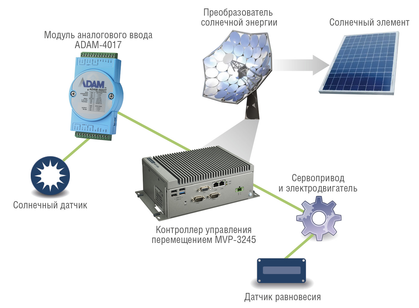 В представленной на рис. 4 схеме модуль удалённого сбора данных ADAM-6017 принимает аналоговые сигналы входного напряжения, поступающие от датчика углового положения Солнца, определяющего направление наиболее сильного солнечного излучения, затем преобразует их в пакетные данные и передаёт на контроллер управления перемещением Advantech MVP-3245 по сети Ethernet. Устройство MVP-3245 управляет шаговыми приводами системы слежения и переориентации, задавая управляющее воздействие электродвигателям и считывая значения с датчиков положения солнечных батарей. Вычисляя разницу между текущим и оптимальным положением, контроллер управляет углом наклона и положением солнечных батарей, добиваясь повышенной эффективности системы сбора энергии.