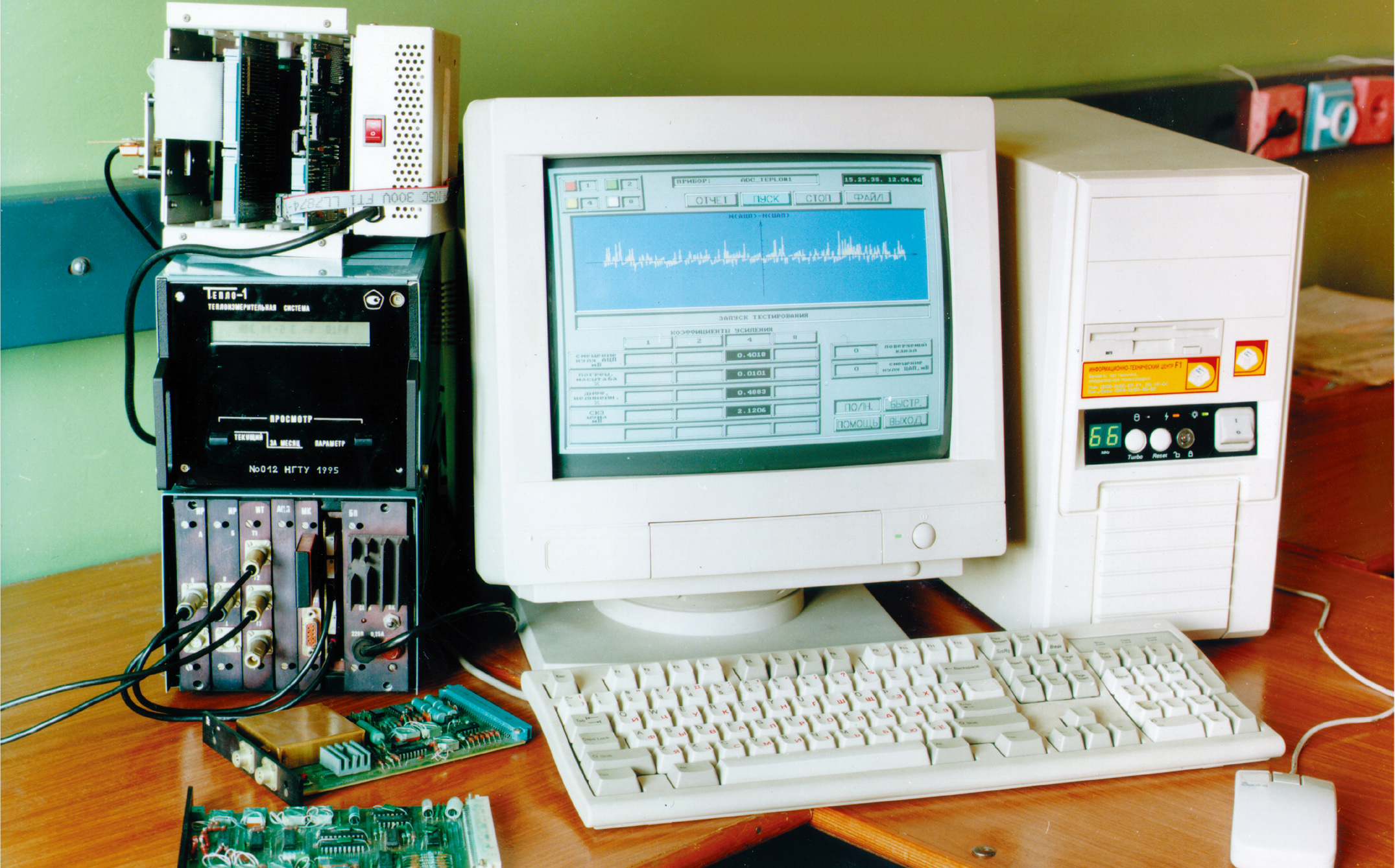 В этой связи понятна необходимость проведения тщательных и продолжительных (в течение нескольких суток) испытаний составных частей и системы в целом. Имеющееся оборудование позволило достаточно просто автоматизировать контроль цифровых узлов теплосчетчика — контроллера и модуля индикации. Автоматизация контроля характеристик и поверки аналоговых узлов: модуля измерения расхода, модуля измерения температуры, модуля АЦП, — а также необходимость проведения комплексных испытаний систем потребовали создания специализированных средств с соответствующими метрологическими характеристиками.
