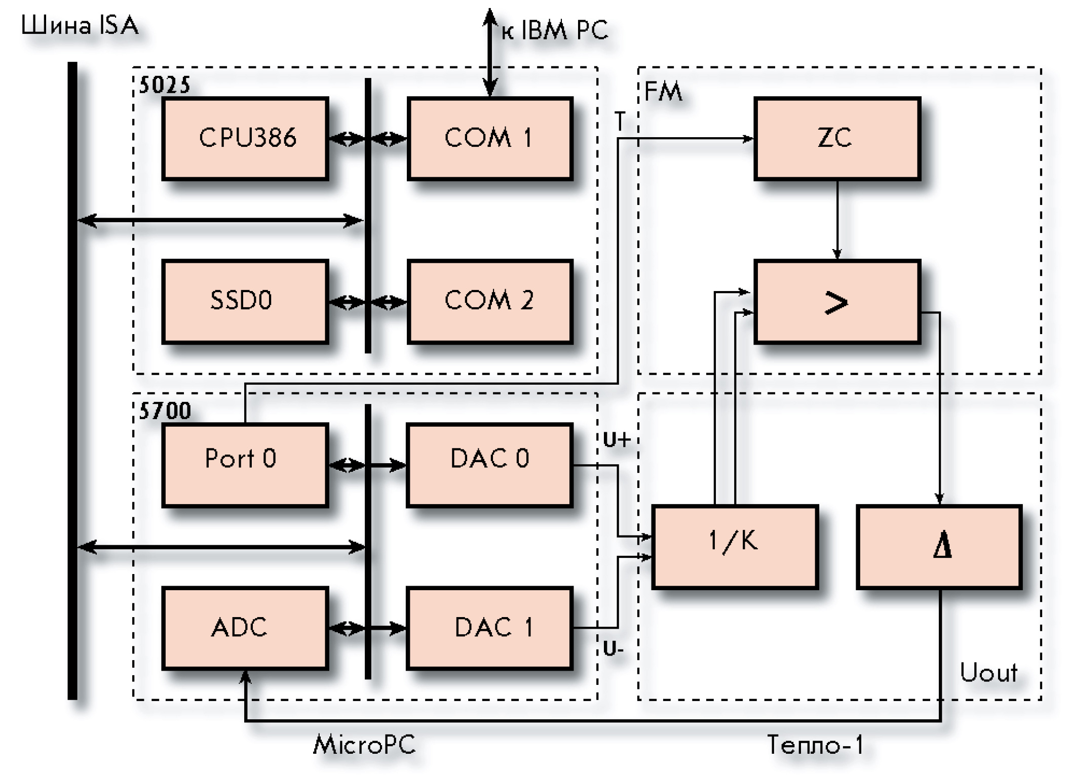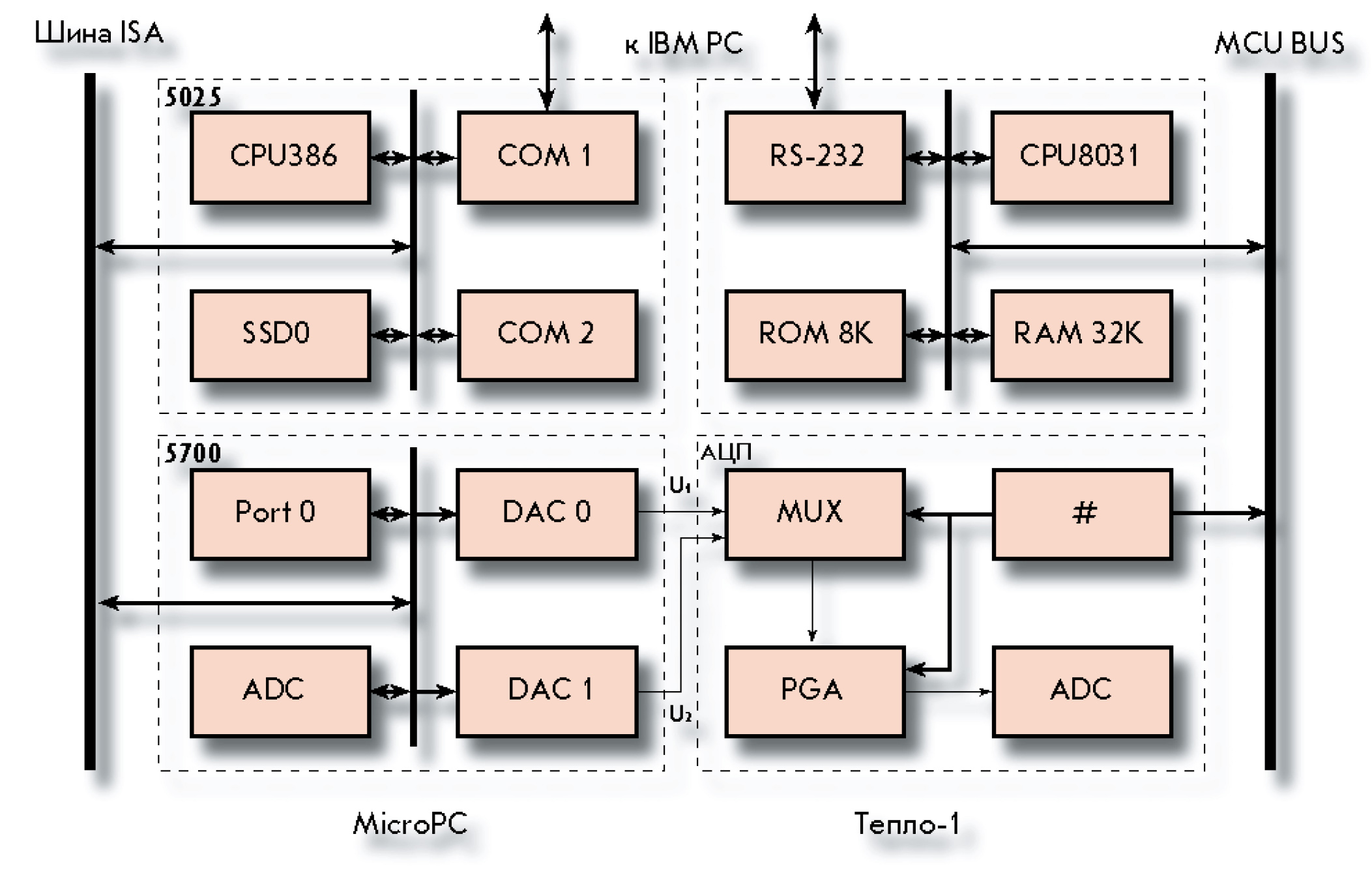 Блок MicroPC в соответствии с заданным режимом испытаний формирует образцовые напряжения U1, U2 для канала АЦП. Настройка АЦП на заданный масштаб и управление запуском в соответствии с требуемой временной диаграммой осуществляется контроллером теплосчетчика MCU, для которого разработана специальная программа тестирования АЦП. Управление блоком MicroPC и контроллером MCU производится из персонального компьютера через последовательные порты.