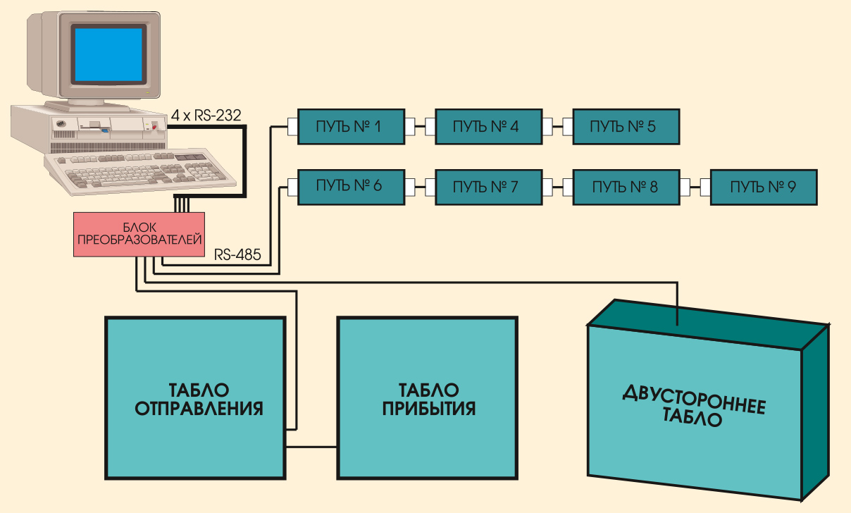 На основе этих блоков были созданы восемь пыле- влагозащищенных табло размерностью 192×16 точек каждое. В состав каждого табло входит промышленный компьютер 5012 фирмы Octagon Systems, оснащенный платой преобразователя интерфейса RS-485 в RS-232. Интерфейс RS-485 позволяет строить небольшие сети (до 32 узлов) с топологией «общая шина». Именно это обстоятельство было использовано при объединении пар табло и управлении ими от одного последовательного компьютерного порта RS-232.