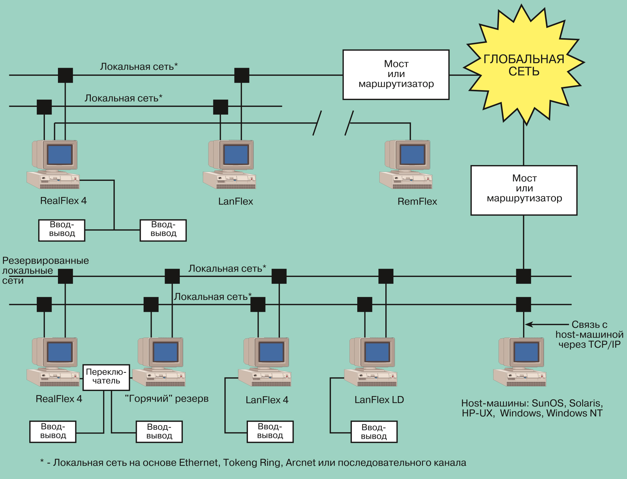 В настоящее время RealFlex поддерживает аппаратуру многих известных зарубежных фирм-производителей контроллеров и плат ввода-вывода. Список поддерживаемых устройств постоянно расширяется, поэтому назовем лишь некоторые из них: Allen-Bradley, Honeywell серии TDC 3000, Metrabyte серии M1000/M2000, Modicon по интерфейсу J470, Yokogawa серий HR 2300, Simatic S5. В качестве одного из наиболее перспективных средств ввода-вывода аналоговой и дискретной информации от объектов АСУ ТП в рамках RealFlex используются компьютеры MicroPC (Octagon Systems, США) со встроенной в ПЗУ или флэш-память операционной системой QNX 2.21 или QNX 4.22. Для RealFlex разработаны драйверы для отечественных контроллеров ТCМ51, Ломиконт-110, Ремиконт-110 и 130, ЭК-2000, Ш-711 и др.