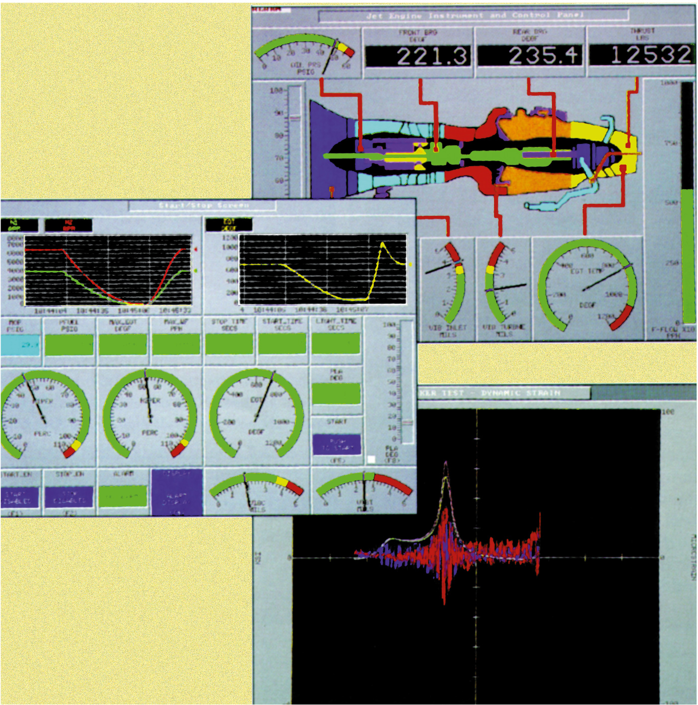 AutoNet — это пакет для сбора данных, управления, тестирования и измерений. Отличительной особенно-стью AutoNet является возможность применения этого пакета в прило-жениях с очень высокими требова-ниями к скорости приема данных. AutoNet обеспечивает возможность поступления и обработки до 50000 измерений в секунду. AutoNet позволяет иметь любое число панелей, отображающих значения принимаемых данных. Эти панели строятся самим пользователем на основе примерно 100 типов динамических элементов отображения и обновляются со скоростью 30 раз в секунду. Динамические элементы обеспечивают отображение как данных реального времени, так и данных предыстории. На рис. 3 приведен пример экрана системы испытания авиационного двигателя, реализованной на основе AutoNet.