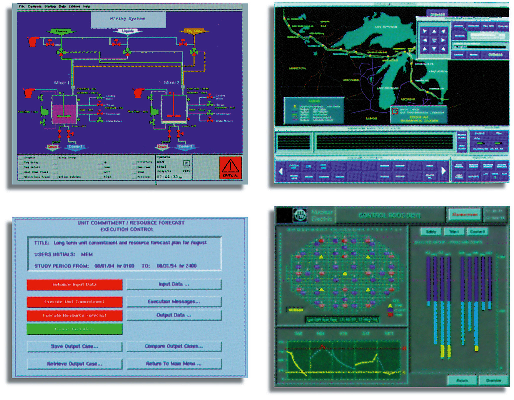 Sammi — средство визуализации динамических данных (DDVT — Dynamic Data Visualisation Tool) —предоставляет простой и эффективный инструмент для развития, тестирования и сопровождения графических приложений, основанных на системе X-Window. Развитая архитектура Sammi идеальна для управляющих и информационных систем реального времени, так же как и для приложений типа клиент/сервер, критичных к времени отклика и требующих высокой производительности. Богатые графические средства Sammi дают возможность создавать распределенные сетевые системы практически без программирования.На рис. 4 приведены примеры экранов систем, реализованных на основе Sammi фирмами Siemens Industrial Automation, Houston Power Company, Valmet Automation и Nuclear Electronic.
