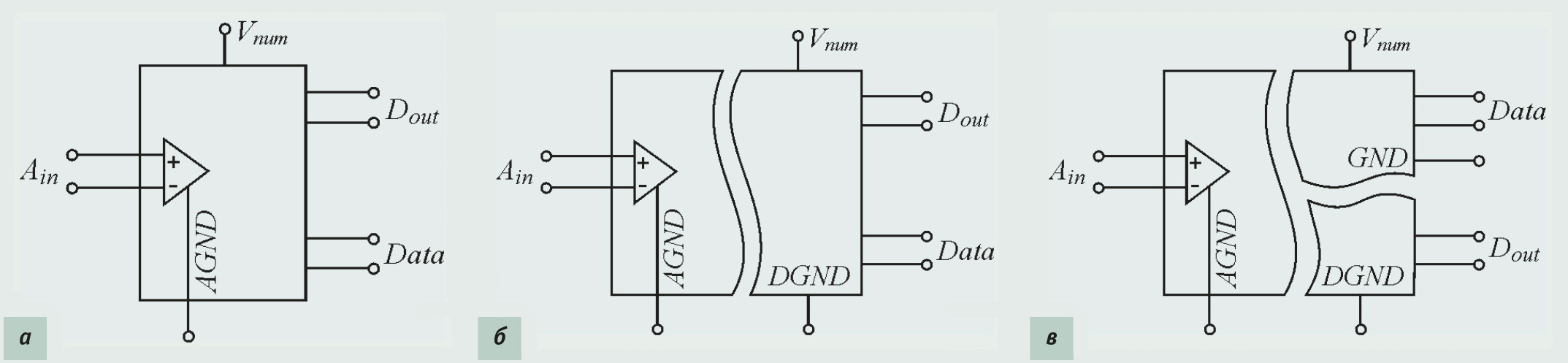 Системы промышленной автоматизации являются аналого-цифровыми. Поэтому одним из источников погрешностей аналоговой части является помеха, создаваемая цифровой частью системы. Для исключения прохождения помех через цепи заземления цифровую и аналоговую землю выполняют в виде несвязанных проводников, соединённых вместе только в одной общей точке. Для этого модули ввода/вывода и промышленные контроллеры имеют отдельные выводы аналоговой земли (AGND) и цифровой (DGND).