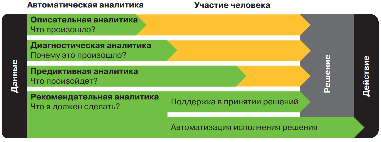 На сегодняшний день развитие сфокусировано главным образом на средствах предиктивной (прогнозной) и рекомендательной аналитики, но для понимания логики развития аналитических систем расскажу обо всех поподробнее. Тем более каждый предыдущий уровень автоматизации аналитических систем является основой для перехода на следующий.