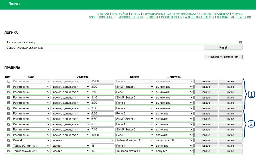 На Рис.3 представлен скрин веб-интерфейса устройства NetPing 4/PWR-220 v8.1/GSM с заданными правилами логики, где: