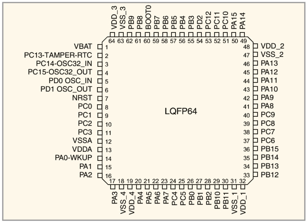 Линейка контроллеров STM32F100 производится в трёх типах корпусов LQFP48, LQFP64 и LQFP100, имеющих, соответственно, 48, 64 и 100 выводов. Назначение выводов представлено на рисунках 2, 3 и 4.