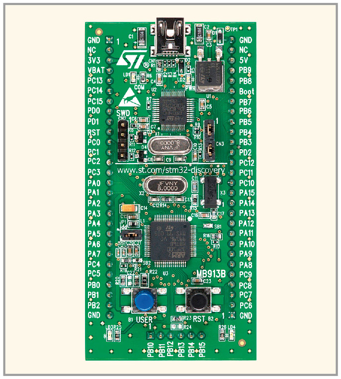 Программирование МК осуществляется через последовательный порт UART1 или через специальные программаторы – отладчики JTAG или ST-Link. Последний входит в состав популярного отладочного устройства STM32VLDISCOVERY [2], изображённого на рисунке 6.