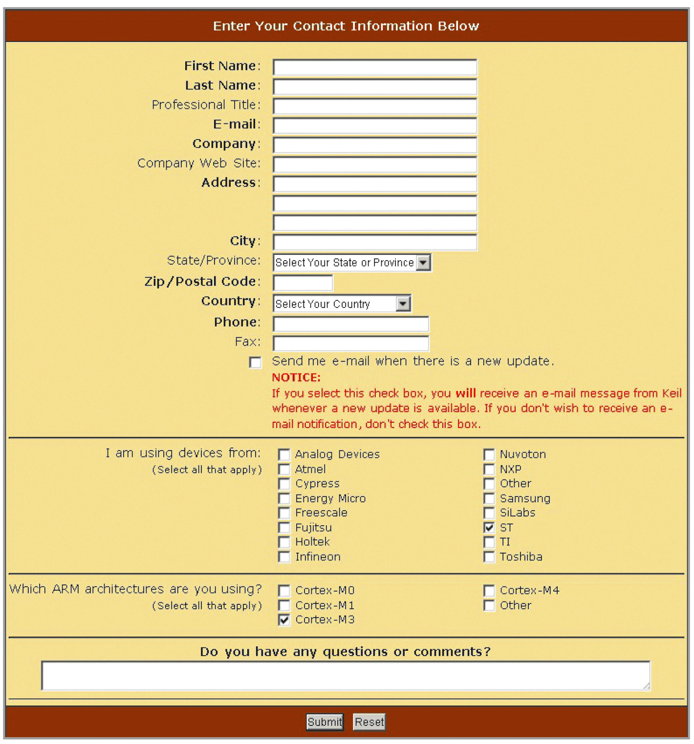 Для установки среды Keil uVision 4 необходимо предварительно зарегистрироваться на Интернет-странице [4] компании, заполнив в форме анкеты (см. рис. 7) соответствующие поля для типа МК, а также поля, выделенные жирным шрифтом.