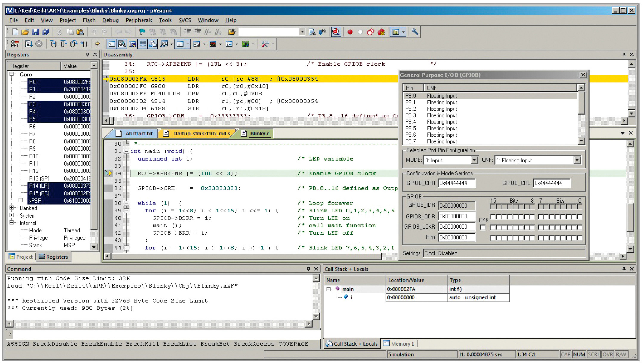Среда программирования Keil uVision 4 позволяет скомпилировать хорошо оптимизированный и компактный код программы. Кроме того, компания Keil может предоставить операционные системы реального времени, библиотеки программ, стеки USB, стеки TCP/IP и т.п. Комплект поставки среды разработки Keil содержит большое количество примеров программ, которые можно использовать в качестве учебного материала.
