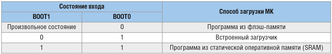 Входы BOOT0 и BOOT1 позволяют выбрать способ загрузки МК при включении питания в соответствии с таблицей.