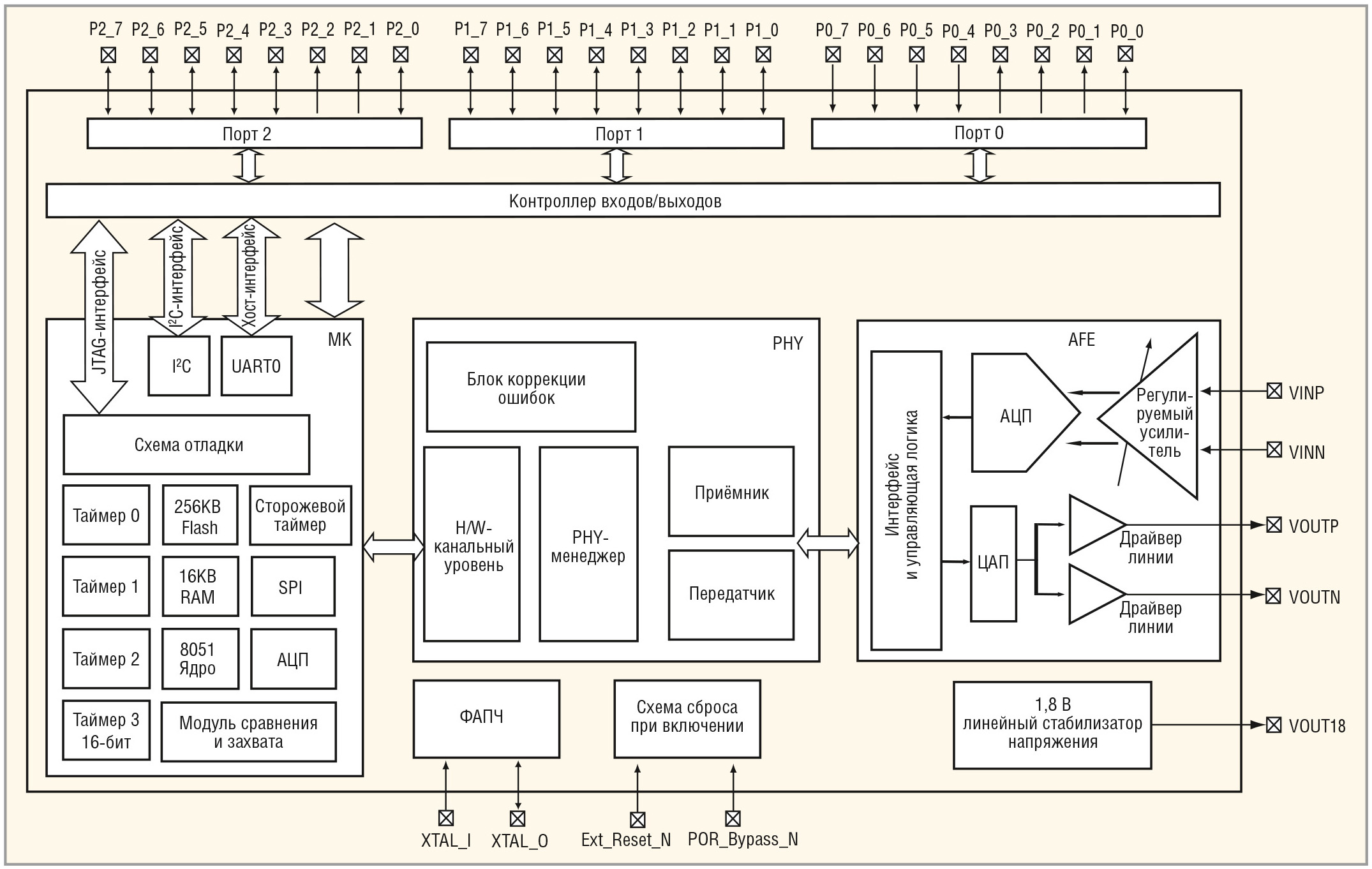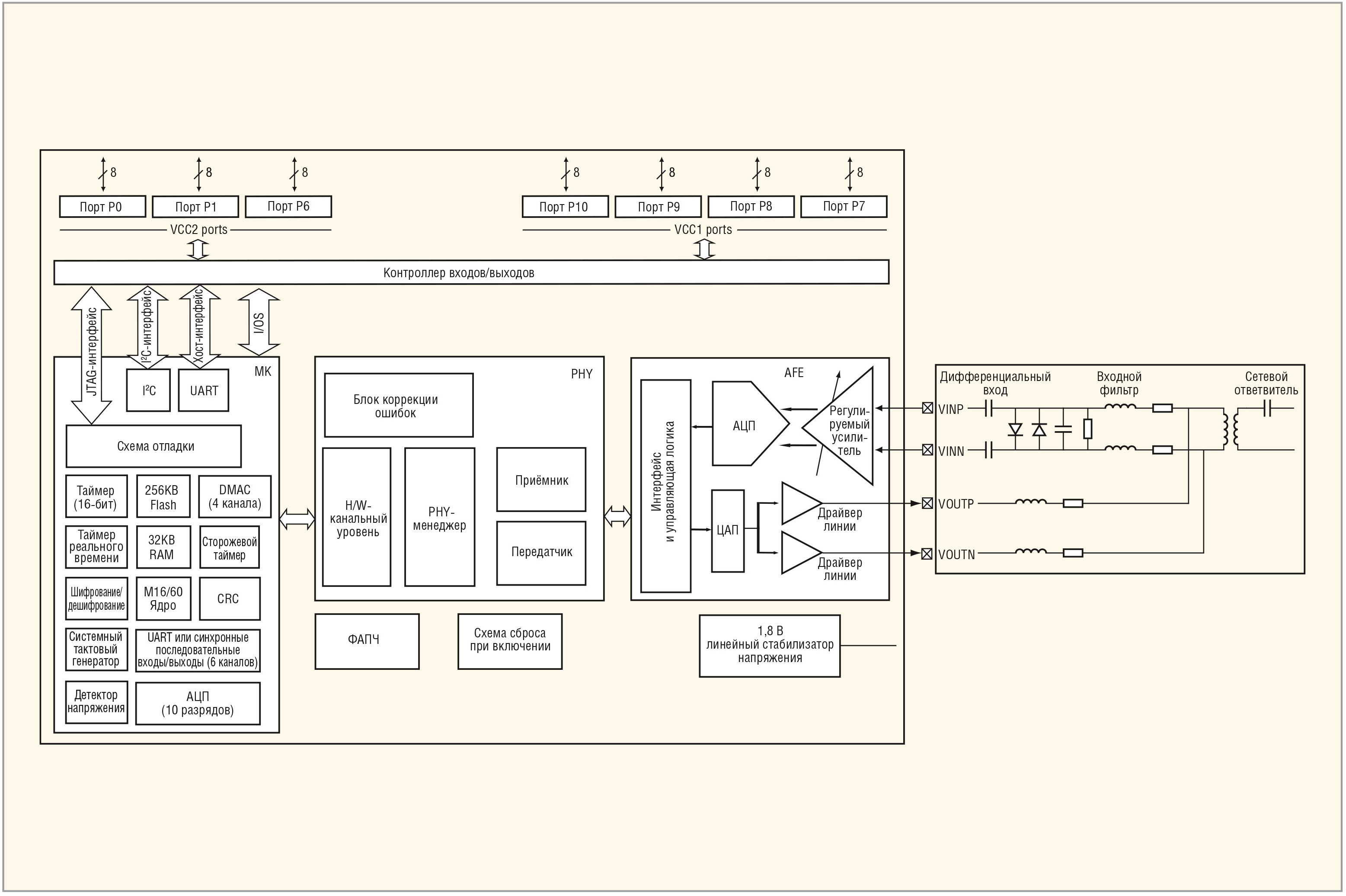 - интерфейсы UART, SPI, I2C, JTAG и специализированный аналого-цифровой;