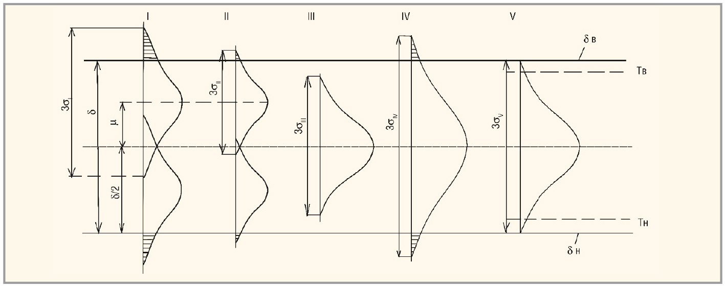 Первая ситуация (I) отражает тот факт, что при реализации технологического процесса наблюдается смещение (μ) середины поля рассеивания по отношению к середине поля допуска, а само рассеивание, равное ±3σI, значительно шире поля допуска. Для приведения процесса в норму, т. е. ликвидации брака (заштрихованные области), необходимо произвести настройку факторов, влияющих на разброс размеров относительно номинала.