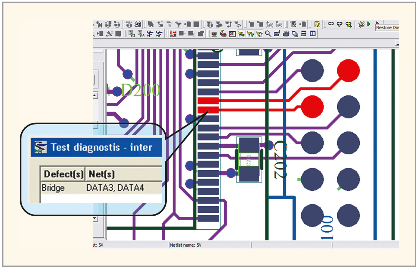 А модуль JT2149/DAF дополняет цифровой тест измерением аналоговых напряжений и частот в выбранных точках. Таким образом, можно построить полноценный испытательный комплекс не только для проверки связей компонентов, поддерживающих периферийное сканирование, но и окружающих их узлов и внешних разъёмов с измерением требуемых аналоговых величин. Все созданные тесты и приложения для программирования затем сводятся в последовательность, часто называемую «тестовым планом», и запускаются нажатием кнопки. При обнаружении неисправности система выдаёт текстовое сообщение с указанием типа дефекта (КЗ, обрыв и др.) и, по требованию, показывает дефектные элементы на рисунке платы или схеме изделия (см. рис. 4).