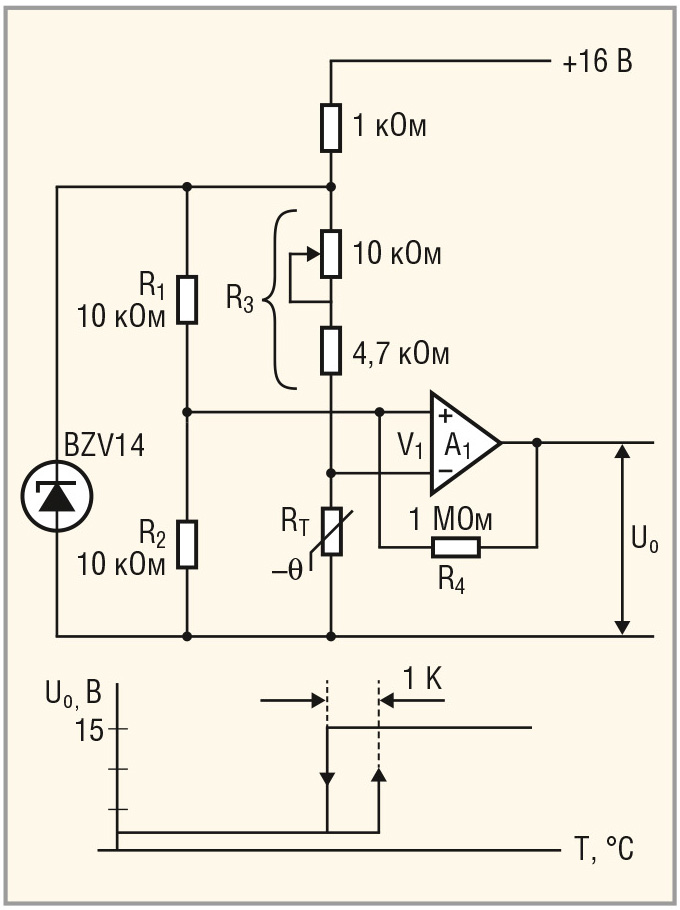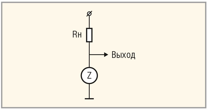 Работа Z-термистора, напротив, не требует дополнительных схем усиления и преобразования для получения сигнала управления. Явление управляемой скачковой проводимости обеспечивает предварительную обработку неэлектрического входного воздействия в объёме кристалла на молекулярном уровне, и выходной сигнал не требует дополнительного усиления и преобразования. Схема включения Z-термистора для аналогичных целей получения сигнала управления включает в себя лишь одно нагрузочное сопротивление, служащее для ограничения тока через структуру и съёма выходного сигнала (см. рис. 4).