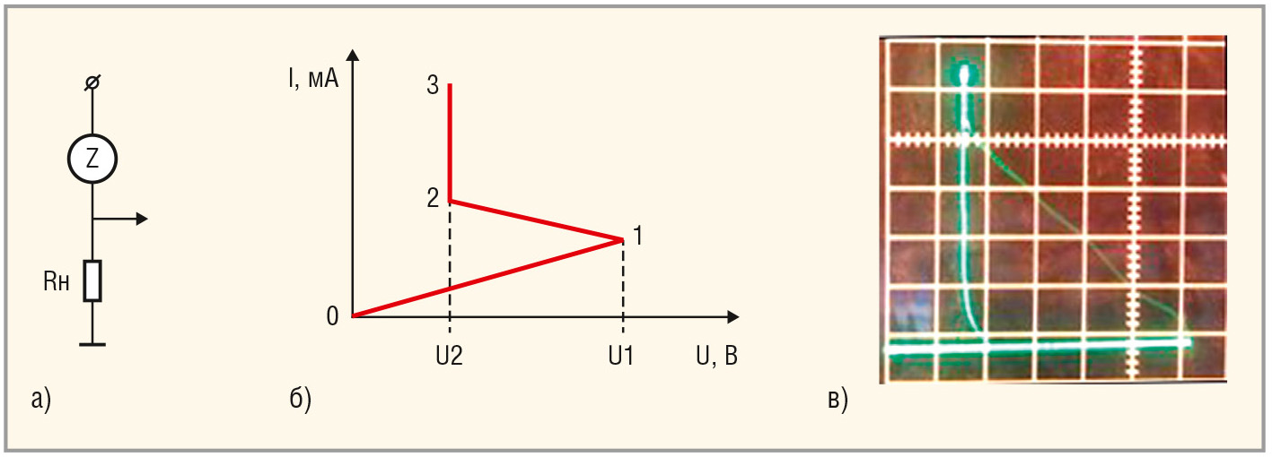 Уникальность свойств Z-сенсоров обусловлена физическим явлением управляемой скачковой проводимости. На рисунке 5 показана схема включения типового Z-сенсора и вольтамперная характеристика (ВАХ) полупроводниковой структуры. Схема включения является универсальной для всех типов Z-элементов. Способность структур реагировать на изменение конкретного типа внешнего неэлектрического воздействия достигается технологическим путём (глубиной диффузии, концентрацией примеси и др.).