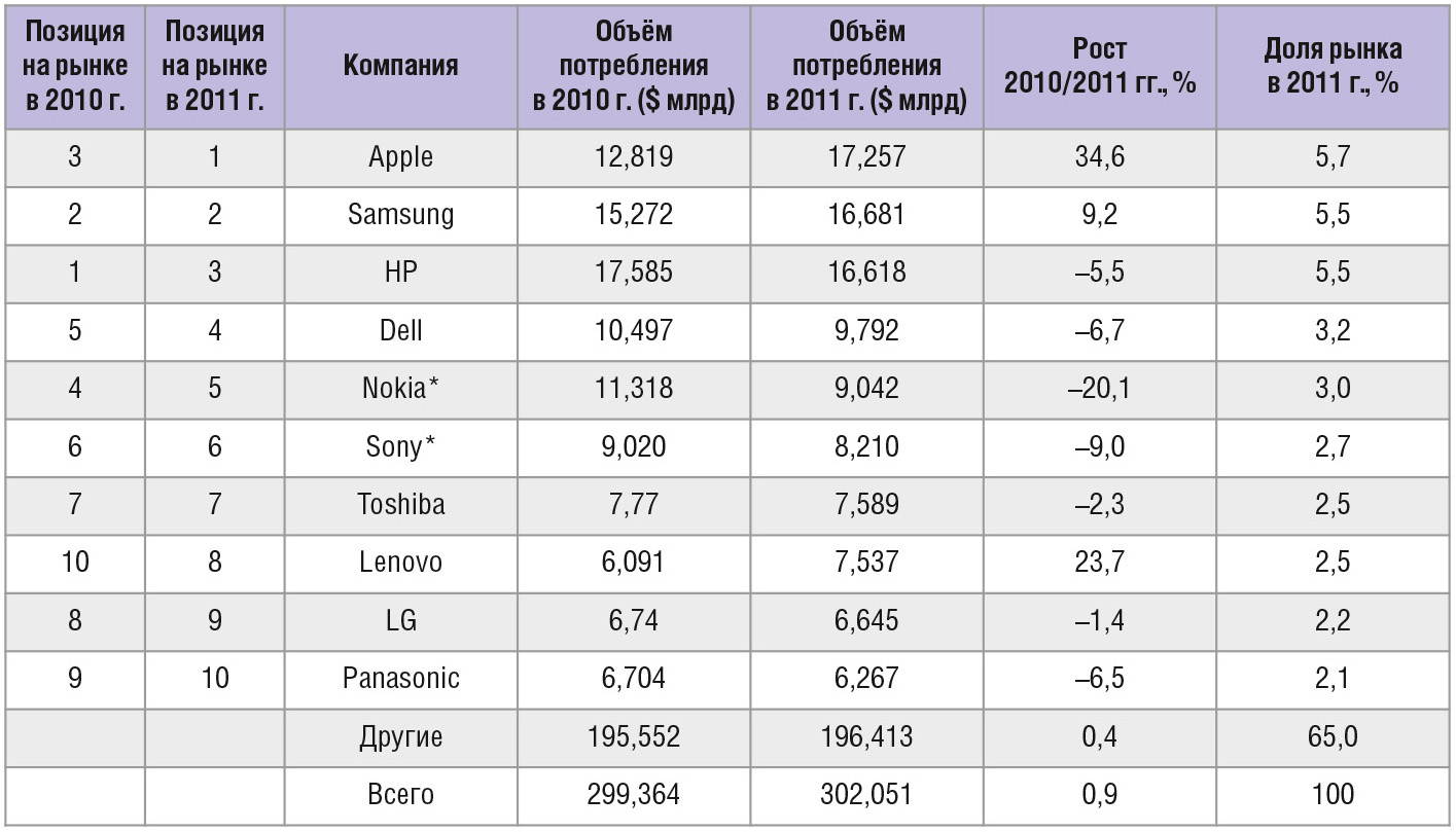 Основными потребителями полупроводниковой продукции стали компании – производители современных средств связи (см. табл. 1). Ввиду растущего спроса на технические средства эксперты рассчитывают, что в 2013 году выручка в сегменте полупроводников увеличится на 6,9%, или до $330 млрд.