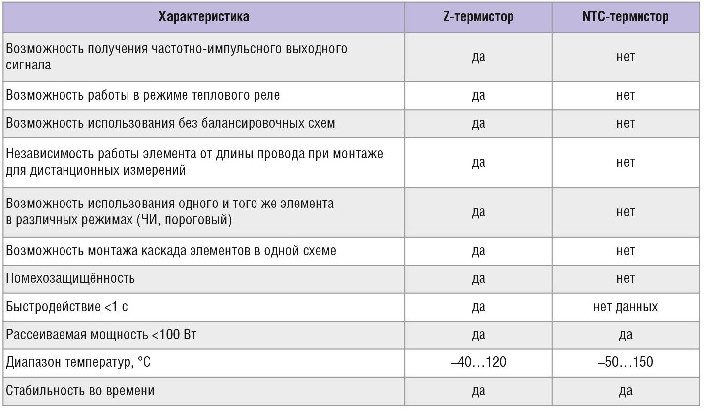 В таблице 2 приведено сравнение возможностей Z-термистора и NTC-термистора без использования дополнительных электронных схем усиления и обработки сигнала. Таблица наглядно демонстрирует преимущества использования элементов, построенных на Z-эффекте.