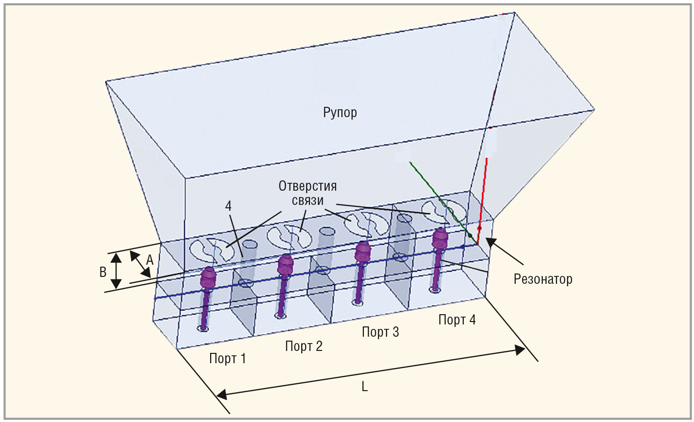 Пассивная часть устройства суммирования мощности в резонаторе и рупорная антенна, излучающая мощность в пространство, были рассчитаны и оптимизированы с помощью программы электродинамического моделирования HFSS Ansoft [4].