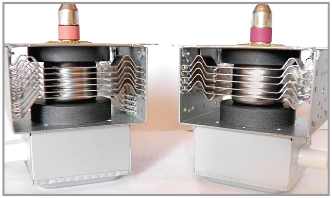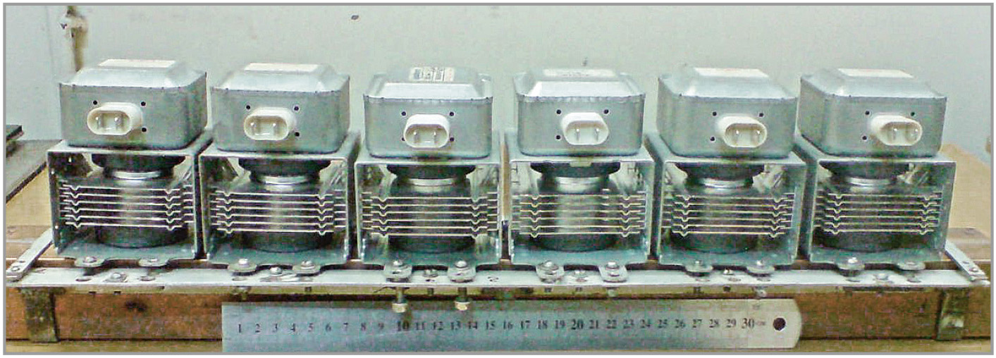 Для синхронизации магнетронов была выбрана схема [3] со стабилизирующим резонатором в виде отрезка волновода с высшим типом колебаний, представляющим собой отрезок прямоугольного волновода, закороченный с торцов (см. рис. 2). В этом стабилизирующем резонаторе основным типом колебаний можно считать волну типа Н104, которая образуется при резонансе. Для селекции данного типа колебаний в резонаторе между широкими стенками через равные промежутки установлены три закорачивающие селекционных вставки (4) в виде штырей. Коаксиальные выводы магнетронов вводятся в полость резонатора со стороны широкой нижней стенки (см. рис. 2). Для возбуждения резонатора используются четыре магнетрона Samsung OM75S (см. рис. 3)