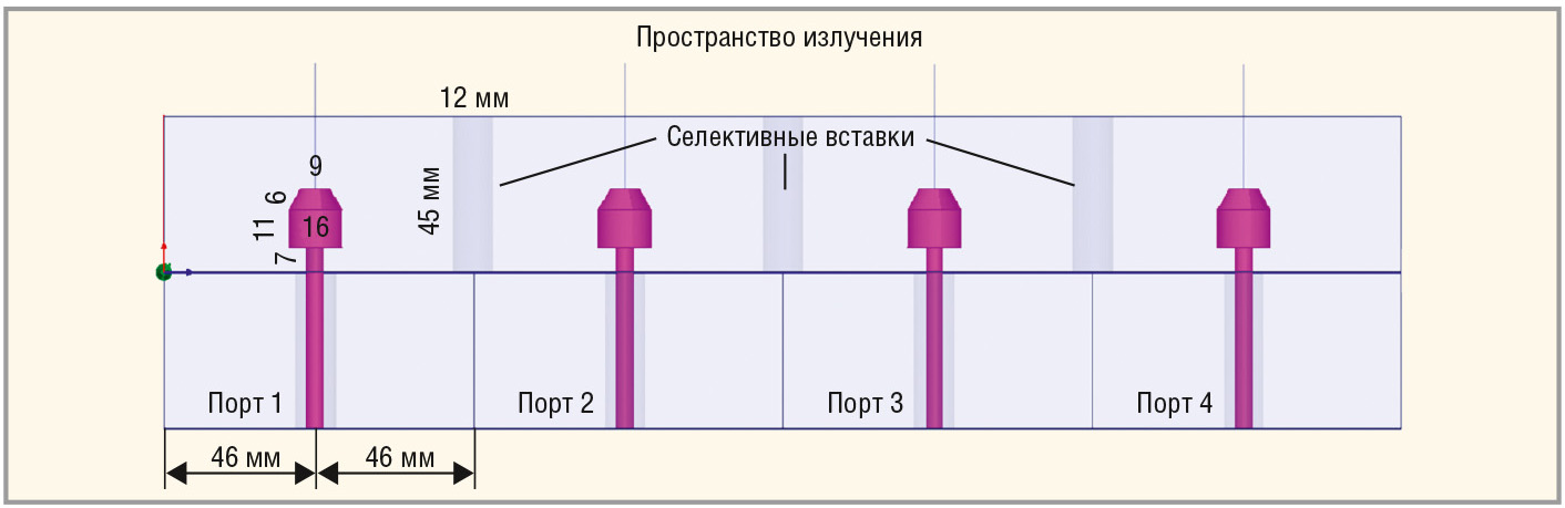 Для создания в пространстве резонатора стоячих волн его размеры были выбраны так, чтобы в резонаторе 3 (см. рис. 2) возникал основной тип колебаний Н104. Исходные данные для моделирования системы суммирования и синхронизации мощности:
