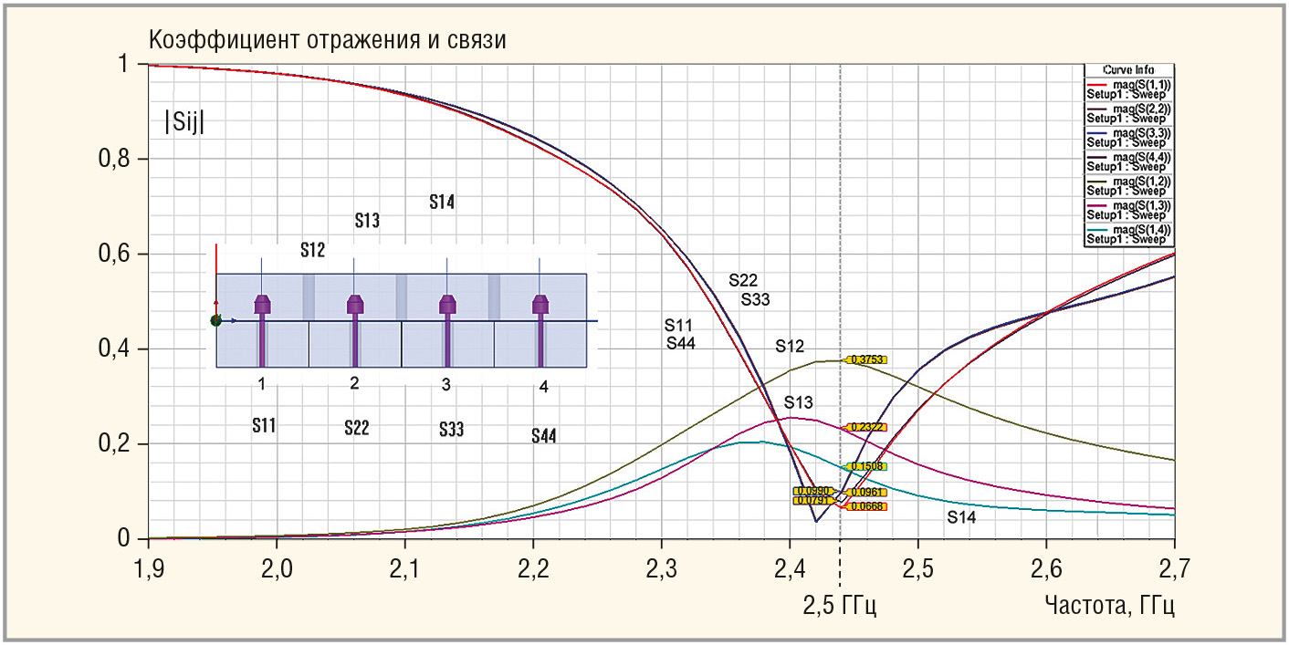 Коаксиальная линия от порта магнетрона имеет характеристический импеданс 50 Ом. Частотные характеристики коэффициентов отражения без рупора представлены на рисунке 5.