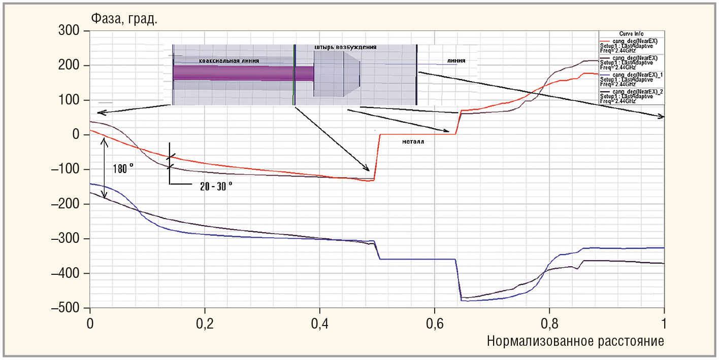 Расчёты показывают, что вдоль линий распространения электромагнитных волн фазы изменяются нелинейно, с разницей около 180 градусов. Это указывает на взаимное влияние магнетронов и их несинхронное рассогласование. Такие физические эффекты можно уменьшить с помощью подбора и оптимизации формы вибратора штыря возбуждения.