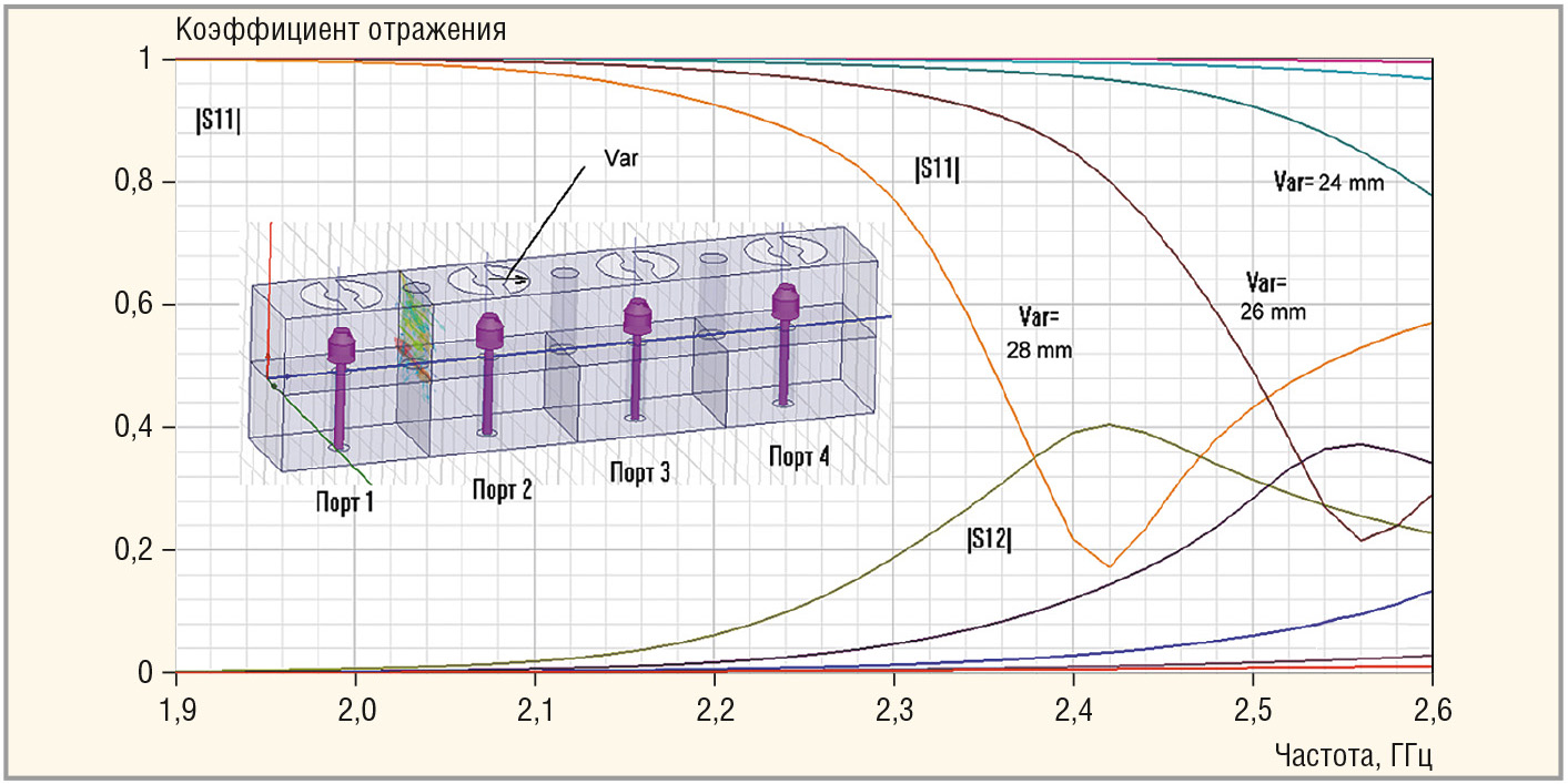 Моделирование трёхмерных СВЧ-структур с помощью электродинамических программ позволяет исключить дорогостоящие макетирование и настройку. В процессе расчётов была проведена оптимизация по размерам отверстий связи (наружному радиусу секторов Var) в полосе частот. График представлен на рисунке 7; видно, что оптимальный радиус находится в районе 27…28 мм.