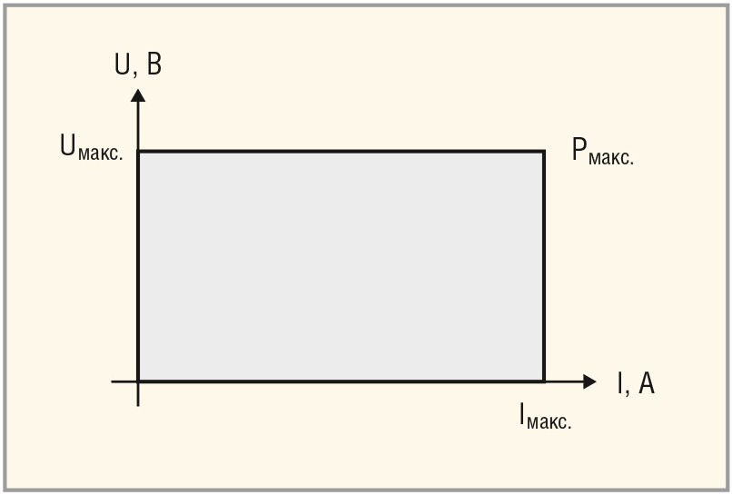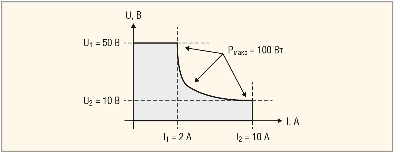 На рисунке 2 показана выходная характеристика типичного ИП с автоматическим выбором диапазона. U1 является максимальным напряжением, а I1 – соответствующим током, определяемым выражением I1 = Pмакс/U1. I2 – это максимальный ток, а U2 – соответствующее напряжение, определяемое выражением U2 = Pмакс/I2. Допустимые токи и напряжения, лежащие на кривой, ограничиваются максимальной мощностью Pмакс.