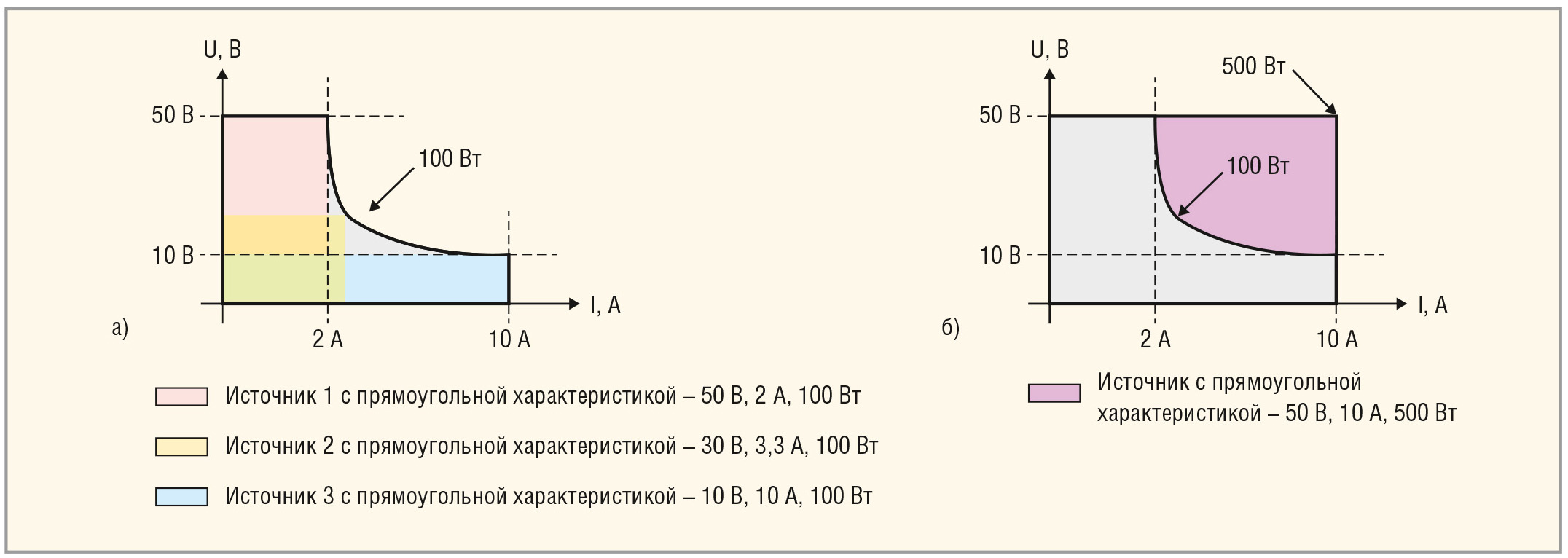 На рисунке 3a автоматический ИП мощностью 100 Вт сравнивается с несколькими 100-ваттными приборами с прямоугольной характеристикой. Чтобы перекрыть тот же широкий диапазон выходных напряжений и токов, понадобится несколько источников питания с прямоугольной характеристикой, которые обойдутся дороже и займут больше места, чем один 100-ваттный автоматический ИП. На рисунке 3б ИП мощностью 500 Вт с прямоугольной характеристикой сравнивается со 100-ваттным автоматическим источником. И хотя, скорее всего, 500-ваттный ИП с прямоугольной характеристикой окажется больше и дороже, он может охватить тот же рабочий диапазон, что и автоматический источник мощностью 100 Вт, и выдать на 400 Вт больше мощности за пределами характеристики 100-ваттного автоматического источника, что, потенциально, может оправдать более высокую стоимость и больший размер.