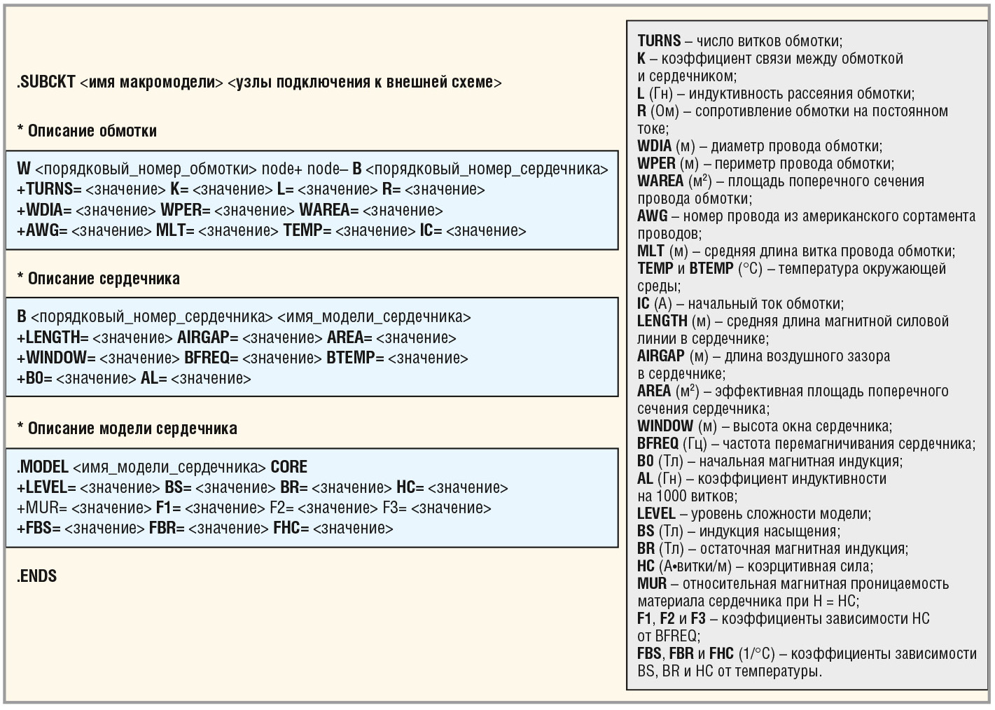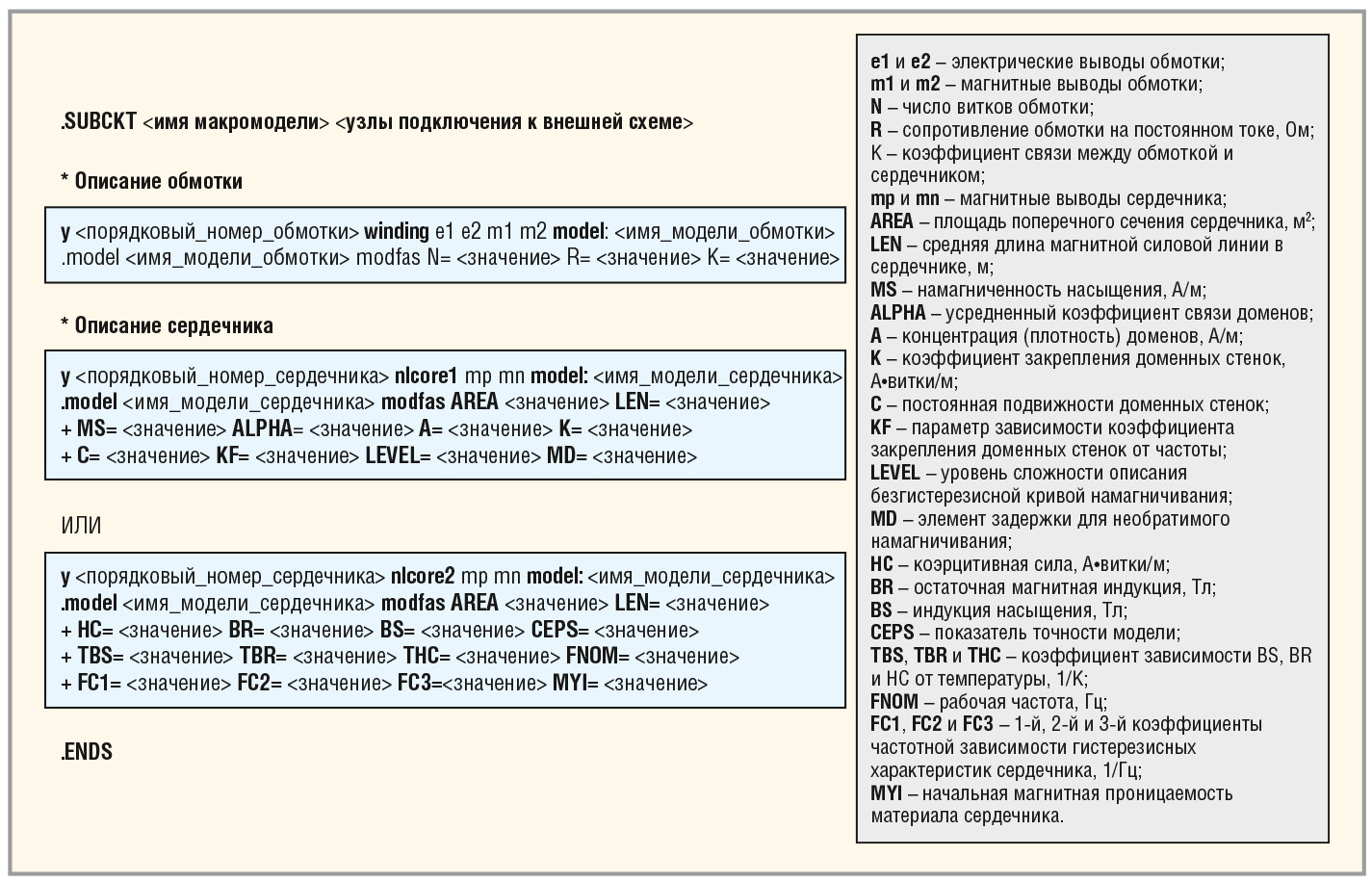 Правила описания макромоделей в системе Eldo аналогичны общим правилам в системе AccuSim II. Описание макромодели трансформатора начинается с ключевого слова .SUBCKT и заканчивается ключевым словом .ENDS. Между ключевыми словами .SUBCKT и .ENDS размещаются строки описания обмотки, магнитного сердечника и моделей обмоток и сердечника. Формат описания макромодели трансформатора с использованием системы Eldo представлен на рисунке 9.