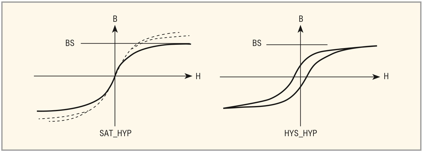 Гиперболическая модель сердечника SAT_HYP предназначена для учёта насыщения сердечника без гистерезиса и используется, когда необходимо быстро просмотреть форму основной кривой намагничивания без значительных затрат времени на проведение моделирования. Если полученная при моделировании кривая совпадает по форме с экспериментально снятой кривой, то для учёта гистерезиса целесообразно повторить моделирование с использованием HYS_HYP модели (см. рис. 4 – слева сплошной линией изображена кривая намагничивания для гиперболической модели).