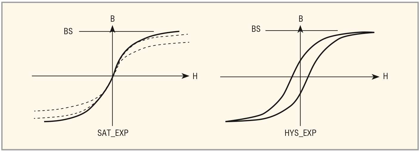 Экспоненциальную модель сердечника SAT_EXP можно использовать для моделирования насыщения сердечника, с тем чтобы быстро получить основную кривую намагничивания сердечника и сравнить её по форме с экспериментально снятой кривой. Перед началом измерений сердечник должен быть полностью размагничен. В случае совпадения кривых, для учёта гистерезиса можно повторить моделирование с использованием модели HYS_EXP (см. рис. 5 – слева сплошной линией изображена кривая намагничивания для экспоненциальной модели).