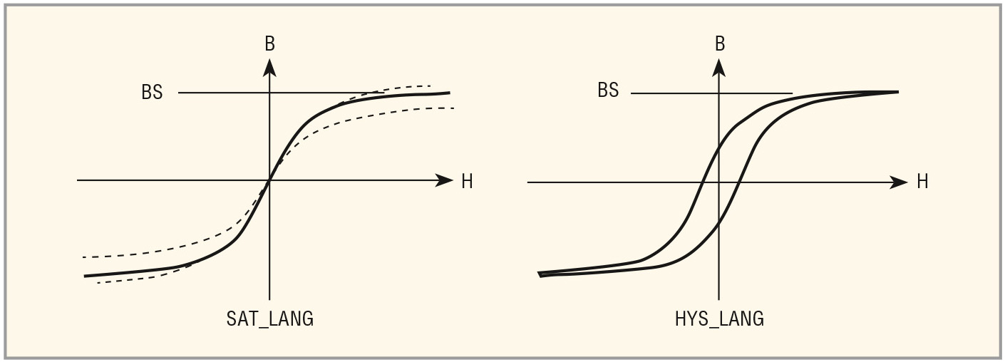 Модель сердечника Лангевина SAT_LANG можно использовать для быстрого моделирования основной кривой намагничивания сердечника с последующим её сравнением с экспериментально снятой кривой. В случае совпадения кривых, для учёта гистерезиса можно повторить моделирование с использованием модели HYS_LANG (см. рис. 6 – слева сплошной линией изображена кривая намагничивания для модели Лангевина).
