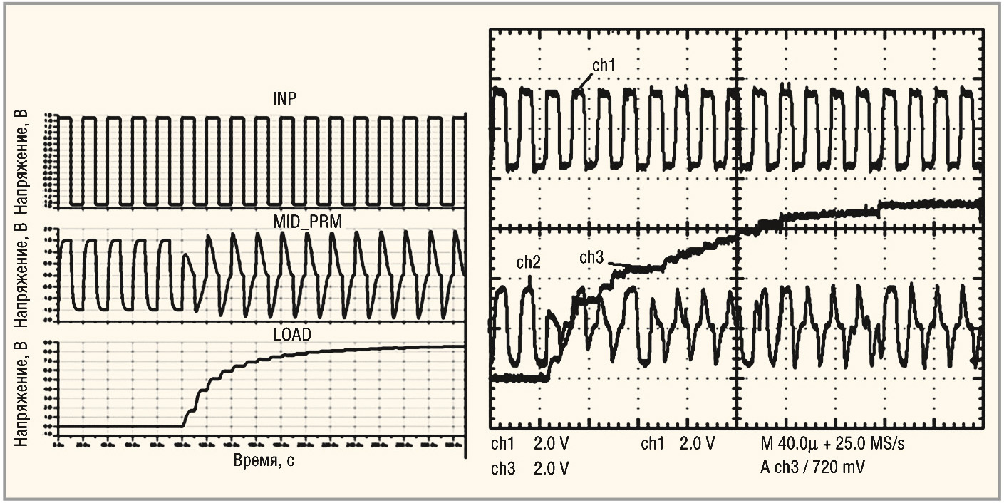 Как следует из результатов моделирования, напряжение на нагрузке CN, RN представляет собой ступенчато нарастающую кривую. При моделировании кривая напряжения на нагрузке стремится к установившемуся значению примерно 8,5 В (сигнал load), экспериментально снятая кривая стремится к значению примерно 7 В (сигнал ch3). Амплитуды напряжений в цепи R1, CK (сигналы mid_prim и ch2) до и после замыкания контакта UPI при моделировании и измерениях практически совпадают. Таким образом, полученная в результате моделирования диаграмма напряжения на нагрузке по установившемуся значению отличается от снятой экспериментальным путём осциллограммы примерно на 18%.