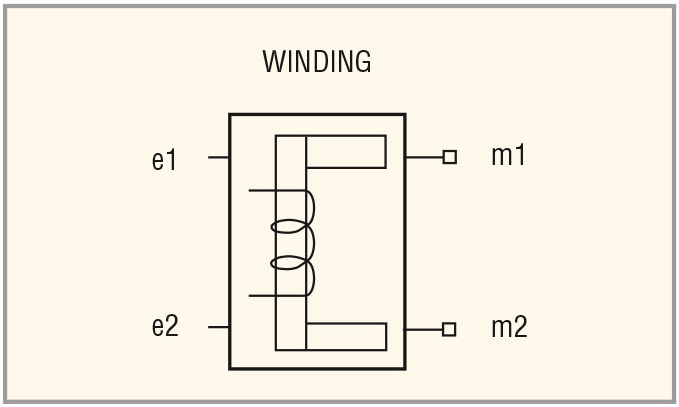 Описание обмотки трансформатора начинается с её обозначения в виде обязательной буквы «y» с последующим порядковым номером обмотки. Затем указывается ключевое слово winding, обозначающее принадлежность модели к моделям обмоток. Далее следуют электрические и магнитные выводы обмотки. Электрические выводы e1 и e2 предназначены для включения обмотки в электрическую цепь макромодели трансформатора. Выводом e1 служит начало обмотки (в обозначении трансформатора помечено «·»), выводом e2 – конец обмотки. Магнитные выводы обмотки m1 и m2 предназначены для включения обмотки в магнитную цепь, состоящую из намагничивающих ампер-витков обмоток (между узлами m1 и m2 каждой обмотки) и магнитного сопротивления сердечника (между узлами mp и mn сердечника (см. ниже). Завершает описание обмотки ссылка на модель в виде ключевого слова model с последующим названием модели обмотки. На рисунке 10 приведено условное графическое обозначение модели обмотки. Его не следует путать с обозначением обмотки на схеме электрической принципиальной.