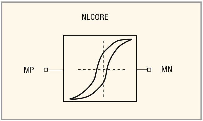 Описание гистерезисных процессов в модели nlcore1 основано на теории движения доменных стенок в магнитном поле. Намагниченность насыщения MS определяет предельный цикл перемагничивания и пропорциональна максимальной индукции насыщения. По умолчанию, MS = 1,7 × 106 A/м. Безразмерный параметр ALPHA представляет собой усреднённый коэффициент связи доменов. ALPHA = 1 × 10–3 (по умолчанию). Безразмерный параметр A характеризует концентрацию (плотность) доменов и по умолчанию равен 1 × 10–3.