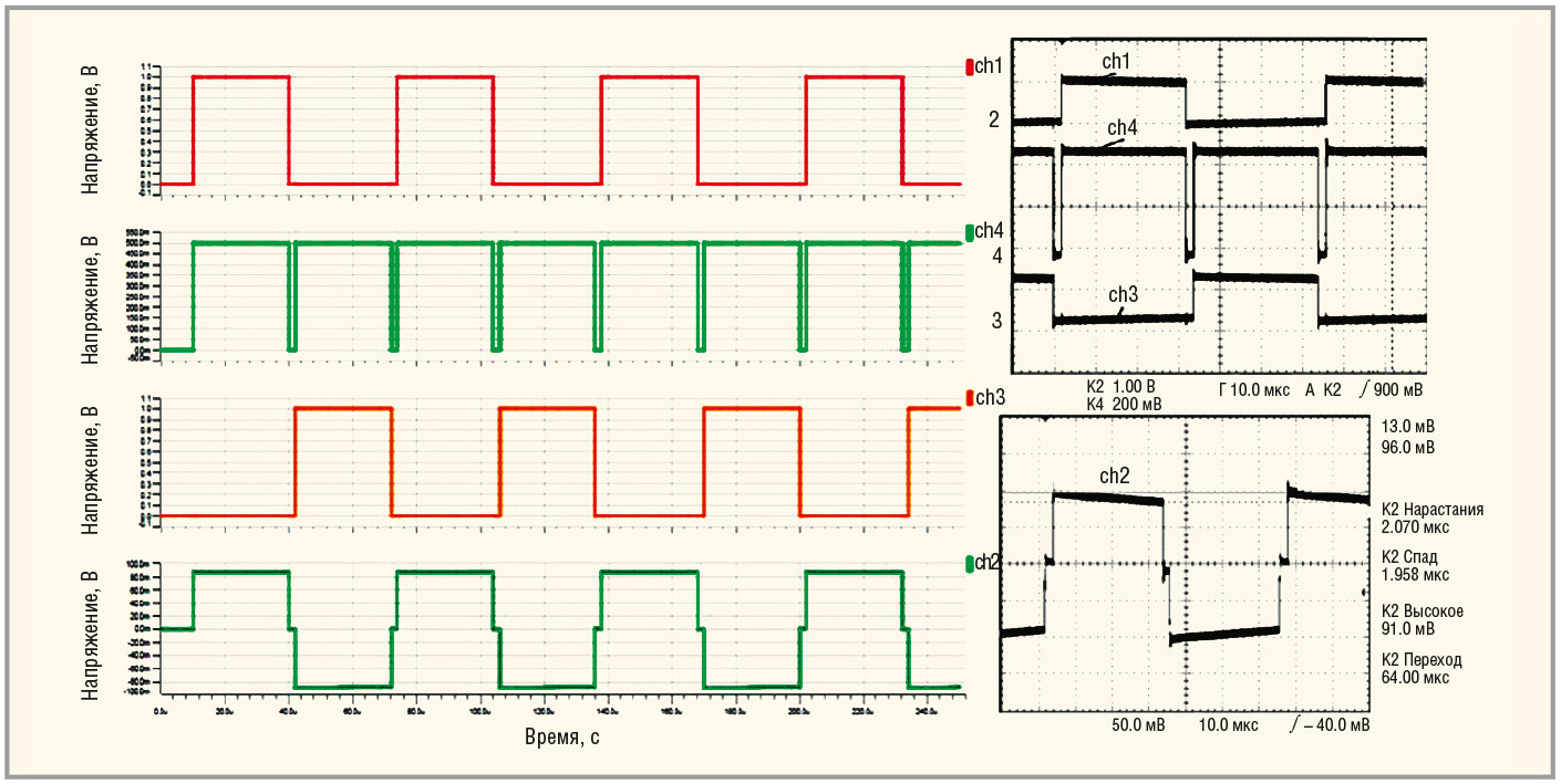 Разница в уровне напряжений может быть объяснена следующим. Наиболее существенный вклад вносит технологический разброс начальной магнитной проницаемости, которая для ферритов марки М2000НМ1 составляет 2000+500–300, т. е. +25%...–15%, что определяет более ранний или более поздний момент наступления насыщения в магнитопроводе (см. осциллограмму на рис. 8). Площади импульсов на первичной обмотке при наблюдении осциллографом заметно меньше, чем аналогичные при моделировании. Соответственно, энергия, передаваемая трансформатором в нагрузку, также меньше. Иными словами, насыщение реального сердечника наступает быстрее.