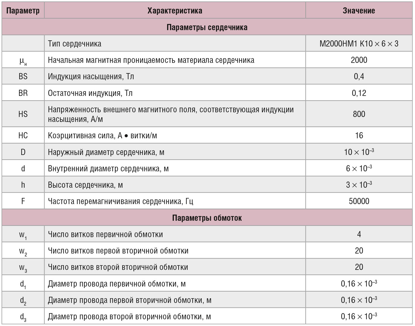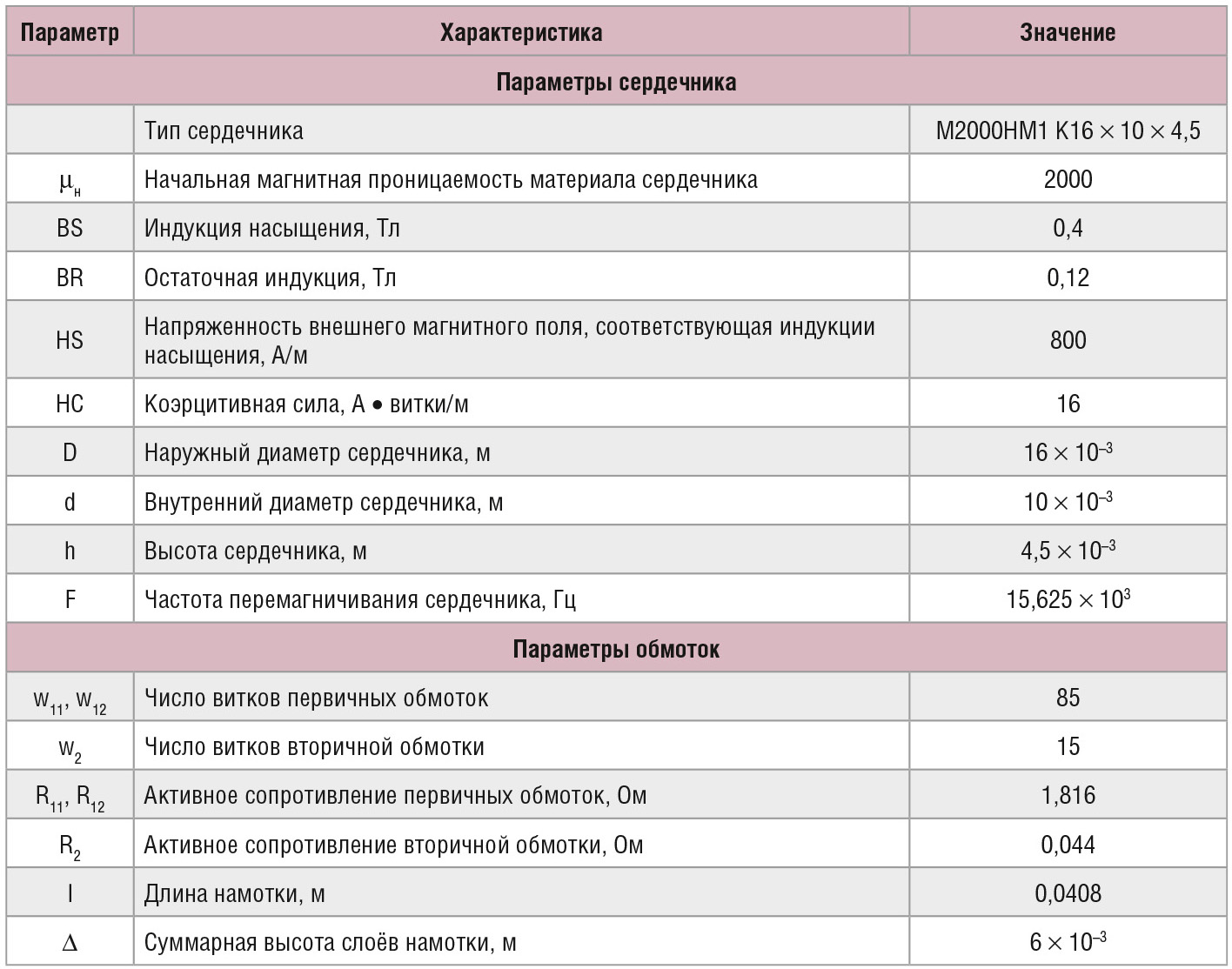 в AccuSim II была составлена макромодель для трехобмоточного трансформатора, выполненного на сплошном тороидальном сердечнике и условно названного transformer_1. Параметры, используемые в описании макромодели, получены из исходных данных в соответствии с расчётами по известным формулам [13–15]. Исходные данные собраны в таблице 1, а содержание файла описания макромодели представлено в Листинге 1.