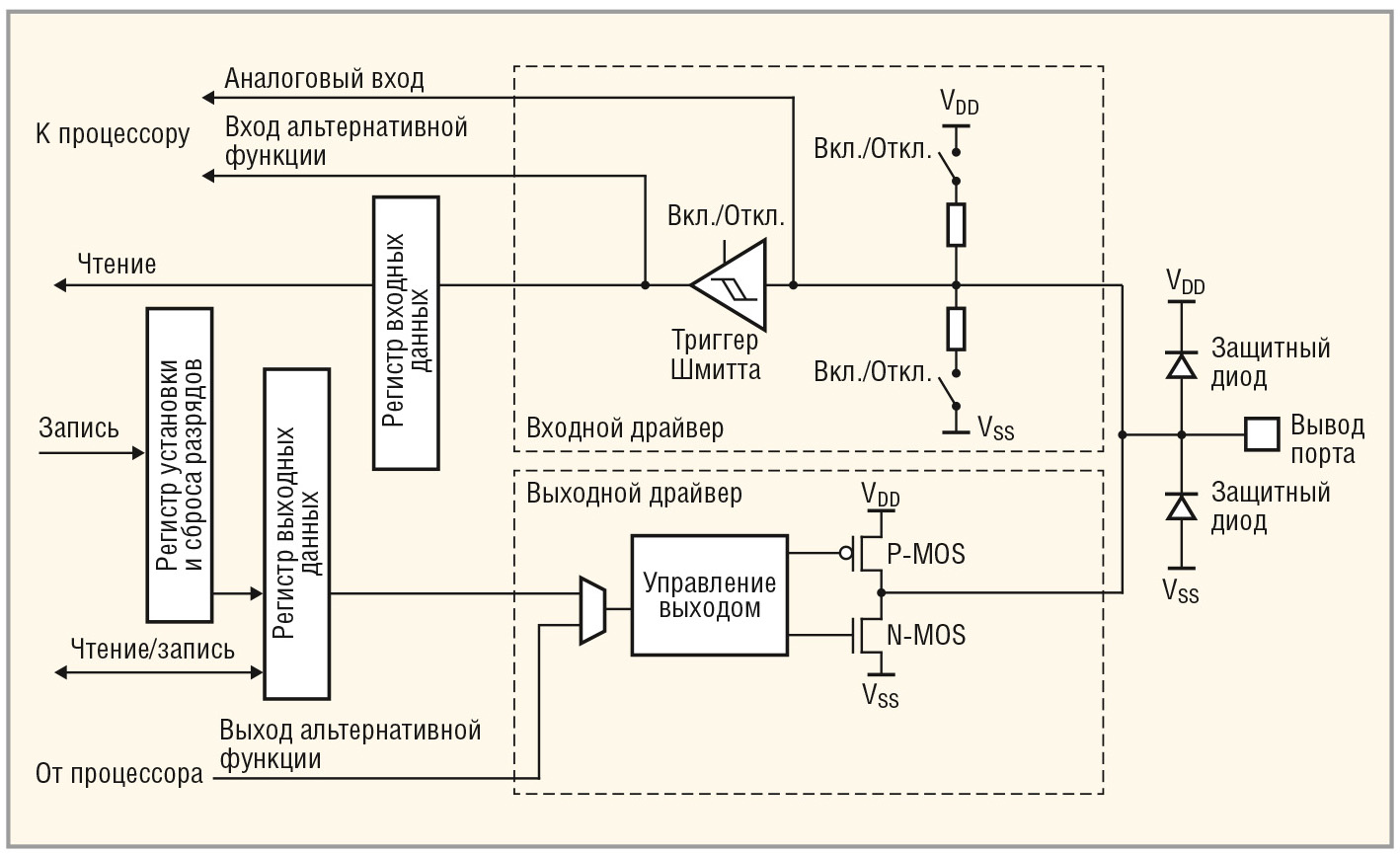 На рисунке приведена структурная схема одного канала порта ввода-вывода, иллюстрирующая вышеизложенное описание. С помощью транзисторов P-MOS и N-MOS выход порта может принимать значения высокого потенциала в качестве логической единицы или нулевого потенциала в качестве логического нуля. Если порт сконфигурирован как выход с открытым стоком, то для управления состоянием линии используется только нижний транзистор N-MOS, а верхний транзистор P-MOS находится в отключенном состоянии.