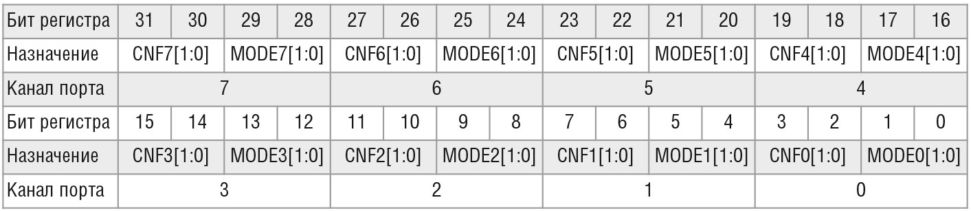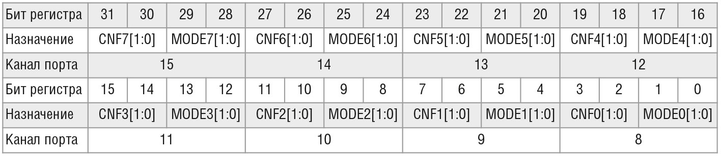Регистры CRL и CRH представляют собой 32-разрядные регистры, задающие режим работы каждого вывода порта. Назначение всех разрядов для регистров CRL и CRH представлено в таблице 1 и таблице 2 соответственно.
