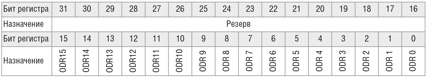 Регистр ODR представляют собой 32-разрядный регистр, предназначенный для записи данных непосредственно в порт. Однако в этом регистре используются только младшие 16 бит. Старшие биты, с 16-го по 31-й зарезервированы. Назначение разрядов регистра ODR представлено в таблице 3.