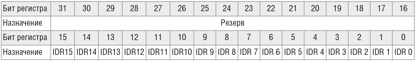 Регистр IDR также является 32-разрядным регистром и служит для чтения физического состояния каналов порта, настроенных на вход. Аналогично регистру вывода ODR, в регистре ввода IDR используется только 16 младших бит из 32. Назначение разрядов регистра IDR представлено в таблице 4.