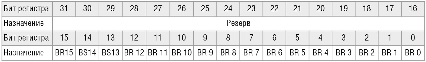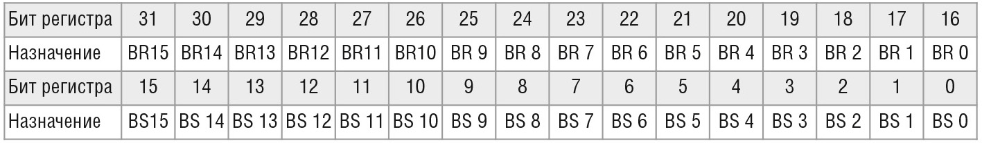 Запись в регистр производится в формате 32-разрядного слова, при этом нулевые биты никакого действия не оказывают. Все разряды данного регистра доступны только для записи. Для исключения неоднозначности при одновременной записи единиц в разряды BS и BR приоритетными будут разряды BS, т.е. выходы каналов установятся в высокий уровень.