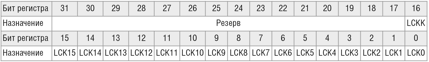 Разряды от 0 до 15-го регистра LCKR определяют каналы порта, а разряд 16 с именем LCKK предназначен для осуществления самой операции блокировки конфигурации. Все задействованные биты данного регистра доступны для записи и чтения.